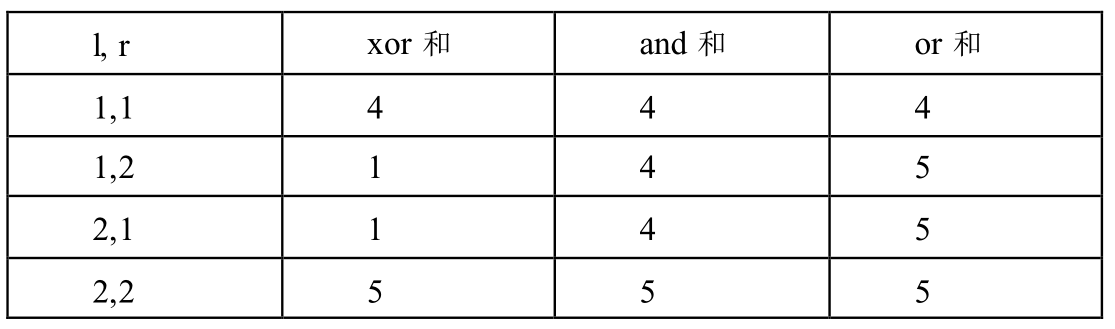 以上没一对$l,r$出现的概率均相同,因此分别对 xor 和、and 和、or 和取平均数就是数学期望值。