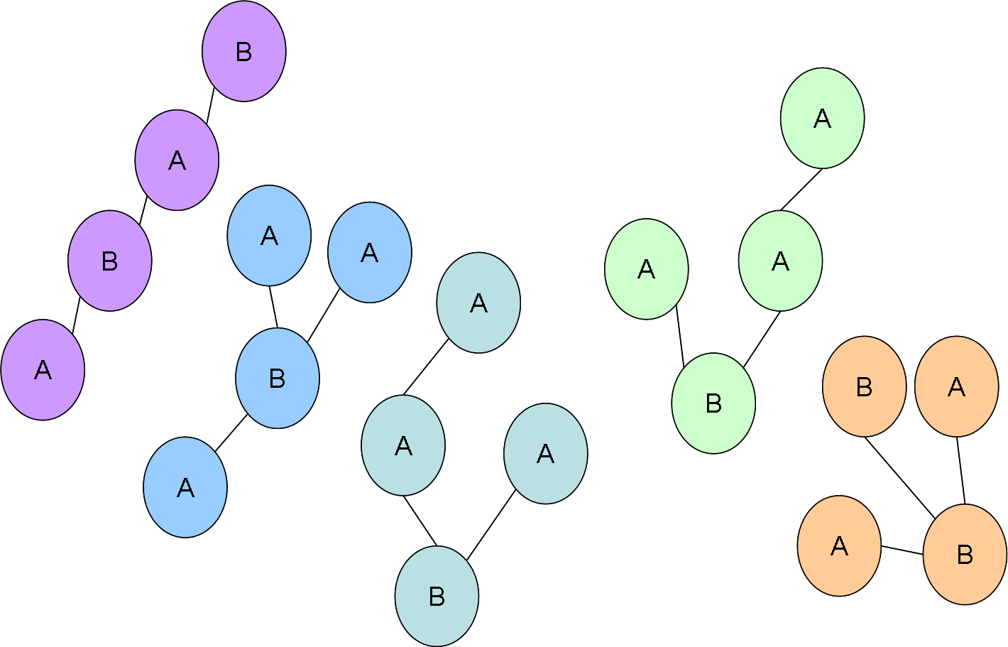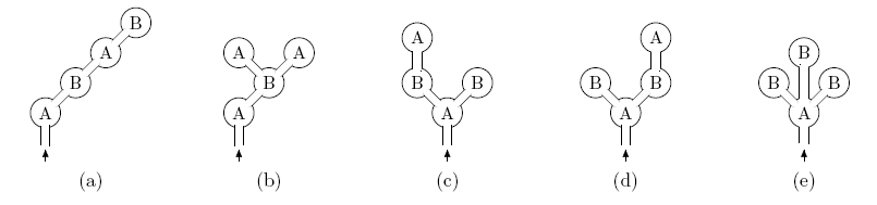因为答案可能很大,你应该输出它模 $1000000000$ 的值。请注意,洞穴的拓扑结构远比它们的绝对位置重要。因此图中的 $(c)$ 和 $(d)$ 被认为是两种不同的洞穴系统。