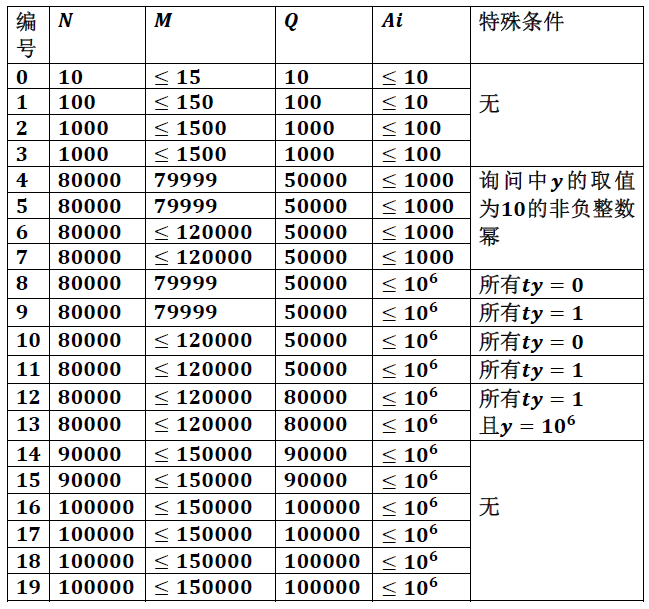 提示:请注意数据范围中的$\leq$,特殊条件中提到的$y$均为询问中的$y$,对于$100\%$的数据,有$y \leq 10^6$。