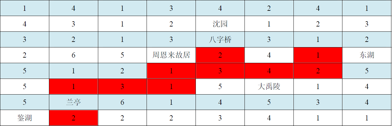 图中用深色标出的方块区域就是一种可行的志愿者安排方案,一共需要20名志愿者。由图可见,两个相邻的景点是直接(有景点内的路)连通的(如沈园和八字桥)。