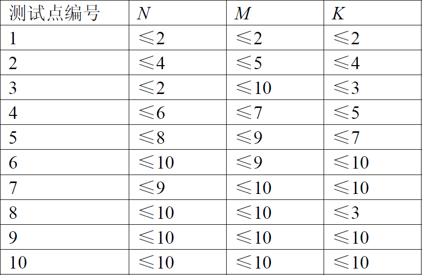 所有的 10 组数据中N, M ,以及景点数 K 的范围规定如下: