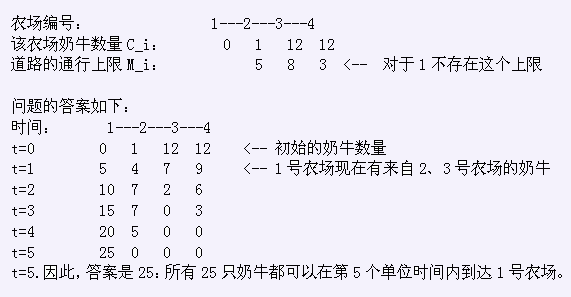 * 任何奶牛都可以在一个单位时间里走过任意多条道路。但是,必须满足每条道路的上限$M_i$。