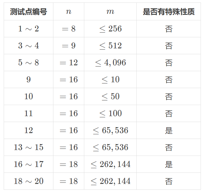对于所有测试数据保证:$2 \le n \le 18$,$1 \le m \le 2 ^ n$,$1 \le u, v \le 2 ^ n - 1$,$1 \le a_i, w \le 10 ^ 9$。