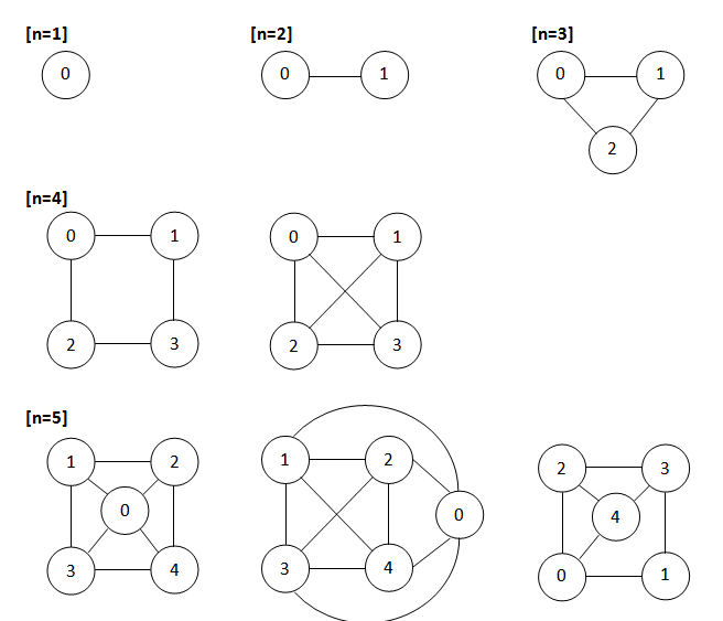 现在SHTSC正在思考,对于一个给定的零件,能否由零件组装机生产组装得到。注意:零件是带标号的,这意味着两个零件即使仅有标号不同也被视为不同的零件。为了帮助你理解问题,SHTSC特地给了你顶点数<=5的零件的图例。