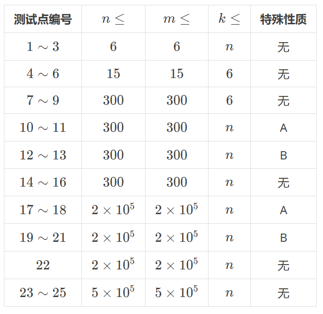 对于所有测试数据保证:$1 \le k \le n \le 5 \times 10 ^ 5$,$1 \le m \le 5 \times 10 ^ 5$。