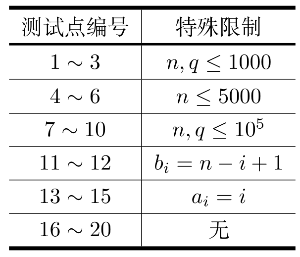 对于所有测试点:$1\leq n,q\leq 5\times 10^5,1\leq a_i,b_i\leq n,1\leq l_i,r_i\leq n$。