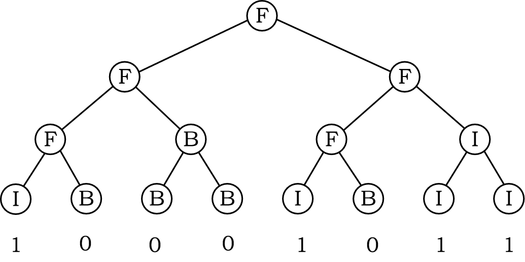 FBI树是一种二叉树,它的结点类型也包括F结点,B结点和I结点三种。由一个长度为$2^N$的“01”串S可以构造出一棵FBI树T,递归的构造方法如下: