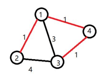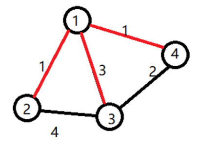 小明选定让赞助商打通了 $1$ 号宝藏屋。小明开发了道路 $1\rightarrow 2$,挖掘了 $2$ 号宝藏。开发了道路 $1\rightarrow 4$,挖掘了 $4$ 号宝藏。还开发了道路 $4\rightarrow 3$,挖掘了 $3$ 号宝藏。工程总代价为: $$\begin{array}{c}1\times 1\\ \small{(1\rightarrow 2)}\end{array}\begin{array}{c}+\\ \ \end{array}\begin{array}{c}1\times 1\\ \small{(1\rightarrow 4)}\end{array}\begin{array}{c}+\\ \ \end{array}\begin{array}{c}1\times 2\\ \small{(4\rightarrow 3)}\end{array}\begin{array}{c}=4\\ \ \end{array}$$