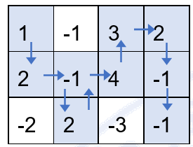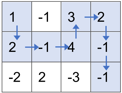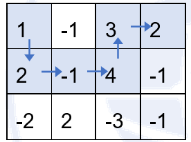 按上述走法,取到的数之和为 1 +2 + (-1) + 4 + 3 + 2 + (-1) + (-1) = 9,可以证明为最大值。