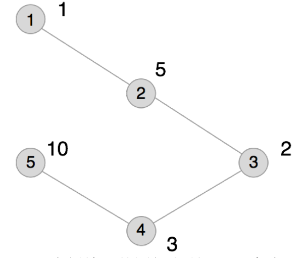 本例输入的图如上所示,距离为 2 的有序点对有(1,3)、(2,4)、(3,1)、(3,5)、(4,2)、(5,3)。其联合权值分别为 2、15、2、20、15、20。其中最大的是 20,总和为 74。