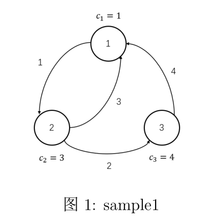 对所有 $1 ≤ i ≤ m$,有 $u_i ≠ v_i$。但数据中可能存在路线重复的单向道路,即可能存在 $1≤i<j≤m$,使得 $u_i = u_j,v_i = v_j$。