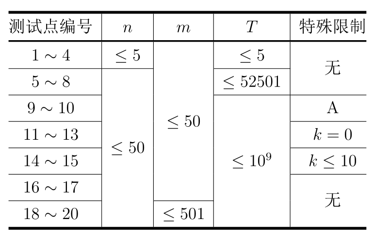$1≤n≤50,n≤m≤501,0≤k≤200,1≤ti≤T≤10^9$。