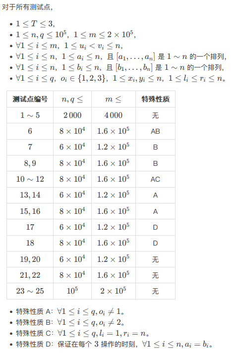 给定一个 $n$ 个点 $m$ 条边的有向图 $G$,结点由 $1$ 至 $n$ 编号。第 $i$ ($1 \leq i \leq m$) 条边从 $u_i$ 指向 $v_i$,保证 $u_i < v_i$。节点 $j$ ($1 \leq j \leq n$) 有两个权值 $a_j, b_j$,保证 $[a_1, \ldots, a_n]$ 与 $[b_1, \ldots, b_n]$ 均是 $1 \sim n$ 的排列。 你需要进行 $q$ 次操作。操作有以下三种: