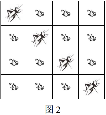 这种情况下蛐蛐国王可以通过将第 2 行第 2 列,和第 3 行第 3 列的两只跳蚤替换为蛐蛐,从而达成他的希望,如图 2 所示。并且,不存在更优的方案,但是可能存在其他替换 2 只跳蚤的方案。