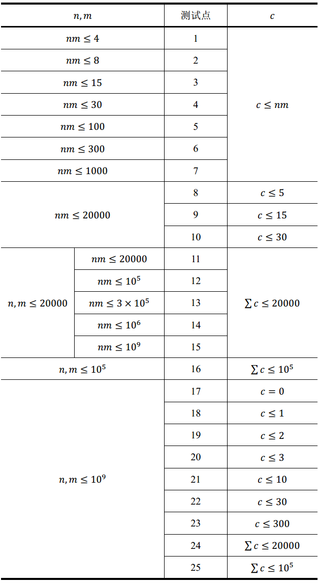 每个测试点的详细数据范围见下表。表中的 n, m, c 均是对于单个输入数据 (而非测试点)而言的, 也就是说同一个测试点下的 T 组数据均满足限制条件; 而 ∑c 是对于单个测试点而言的。为了方便阅读,“测试点”一列被放到了表格的中间而不是左边。