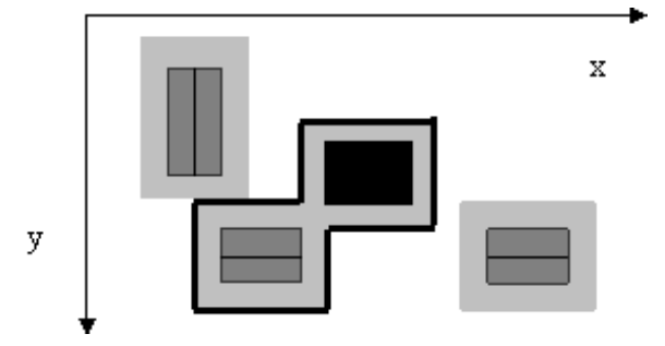 图1:大厦(黑色)和三栋其他建筑,周围环绕着禁止矩形。粗黑线画出了围住大厦的最短合法栅栏。