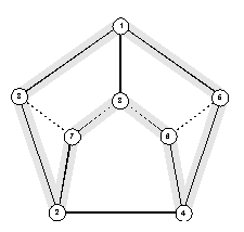 3:从每个房间出发,恰好有三条通道通往另外三个不同的房间。显然,从每个外房间出发的三条通道分别通往它在圆圈上两个相邻的外房间和某个内房间。