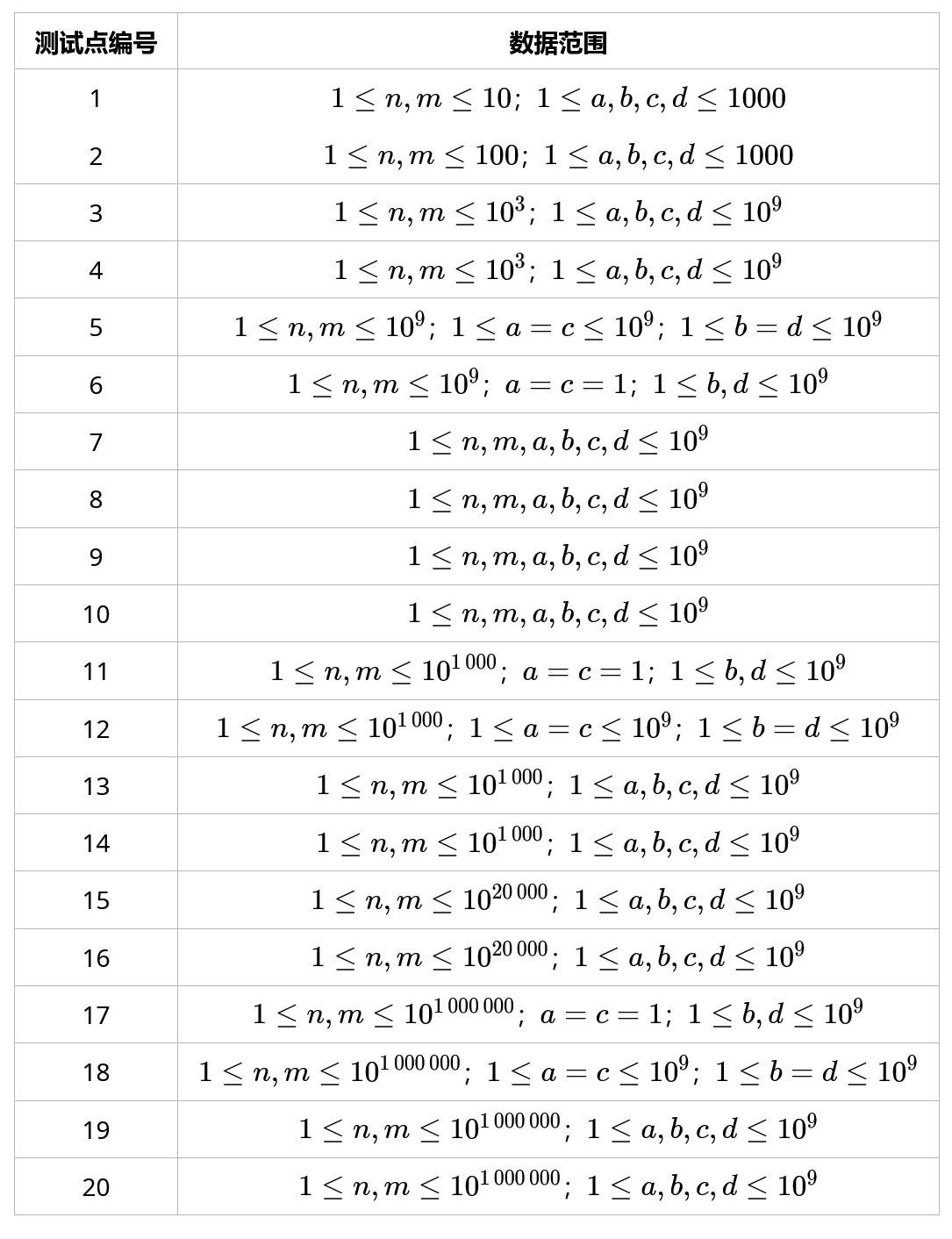 包含一行有六个整数 $n,m,a,b,c,d$,意义如题所述。
