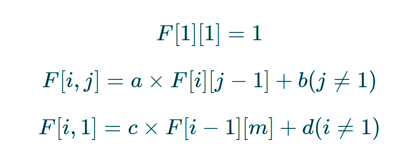 婷婷是个喜欢矩阵的小朋友,有一天她想用电脑生成一个巨大的 $n$ 行 $m$ 列的矩阵(你不用担心她如何存储)。她生成的这个矩阵满足一个神奇的性质:若用 $F[i][j]$ 来表示矩阵中第 $i$ 行第 $j$ 列的元素,则 $F[i][j]$ 满足下面的递推式: