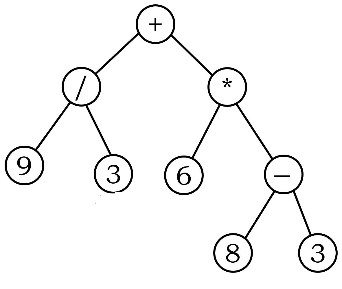 例如,中缀表达式9/3+6*(8-3)可以转化为如下二叉树:
