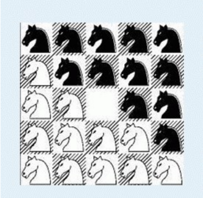 在一个5×5的棋盘上有12个白色的骑士和12个黑色的骑士, 且有一个空位。在任何时候一个骑士都能按照骑士的走法(它可以走到和它横坐标相差为1,纵坐标相差为2或者横坐标相差为2,纵坐标相差为1的格子)移动到空位上。 给定一个初始的棋盘,怎样才能经过移动变成如下目标棋盘: 为了体现出骑士精神,他们必须以最少的步数完成任务。