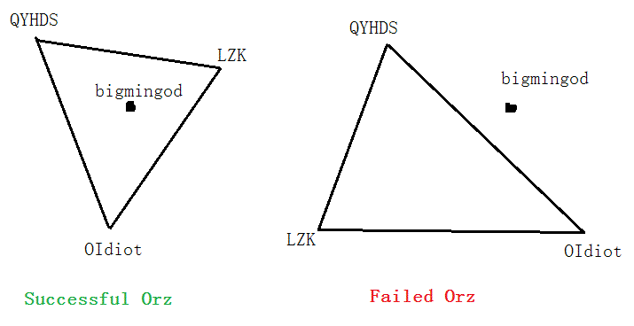 bigmingod 是F.M.S信息组的组草,同时也是万人膜拜的神犇,整个年级暗恋他的女生不计其数,这让机房里的三只蒟蒻QYHDS,LZK,OIdiot羡慕嫉妒恨。为了获得像bigmingod一样的成就,这三只蒟蒻决定每次竞赛课前对他进行膜拜——三个人构成一个三角形,将bigmingod包围在内部(不包括边上),称为膜拜成功!