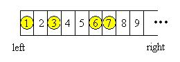 他们在纸上绘制一排网格,将网格从左到右依次编号 1,2,3,......,并将 N 个西洋棋棋子放在不同的网格上,如下图所示:
