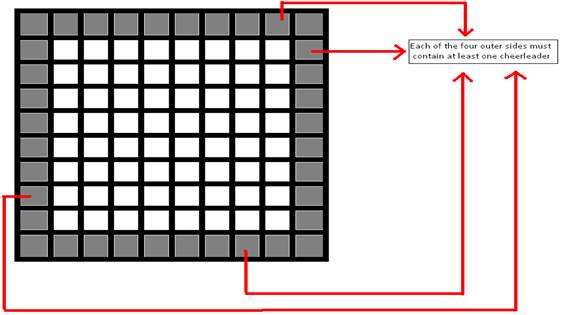 $*\ 4$ 条边上每条边至少有一名拉拉队员。需要注意的是,放置一个拉拉队员在一个角落里的网格中相当于同时涵盖两条边。