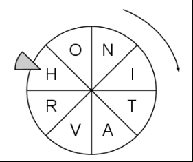 小x刚买了一个字母轮盘(如下图所示),这个轮盘被分成了N部分,每部分上被标记了一个大写英文字符。并且保证这个英文字符只会出现一次。这个轮盘只会顺指针转动,并且有一个指针会指向一个字符,下图中的轮盘分成8部分,每部分都有一个大写英文字符,指针指向 ‘H’ 。