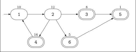 市中心在路口1,由一个入口符号→来标识,那些有酒吧的路口用双圈来表示。每个ATM机中可取的钱数标在了路口的上方。在这个例子中,Banditji能抢劫的现金总数为47,实施的抢劫路线是:1-2-4-1-2-3-5。