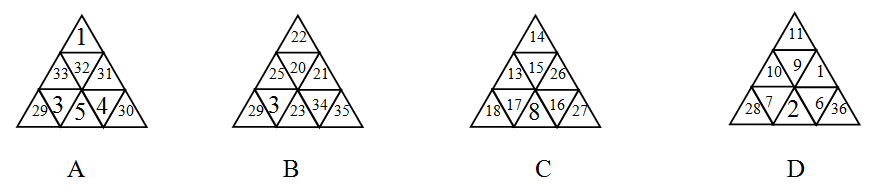 如右图,边长为3的正三角形被分成三层共9个小的正三角形,我们把它们从顶到底,从左到右以1~9编号,见右图。同理,边长为n的正三角形可以划分成n2个单位三角形。
