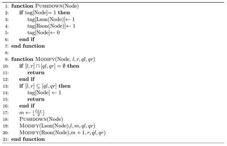 线段树的核心是懒标记,下面是一个带懒标记的线段树的伪代码,其中 $tag$ 数组为懒标记: