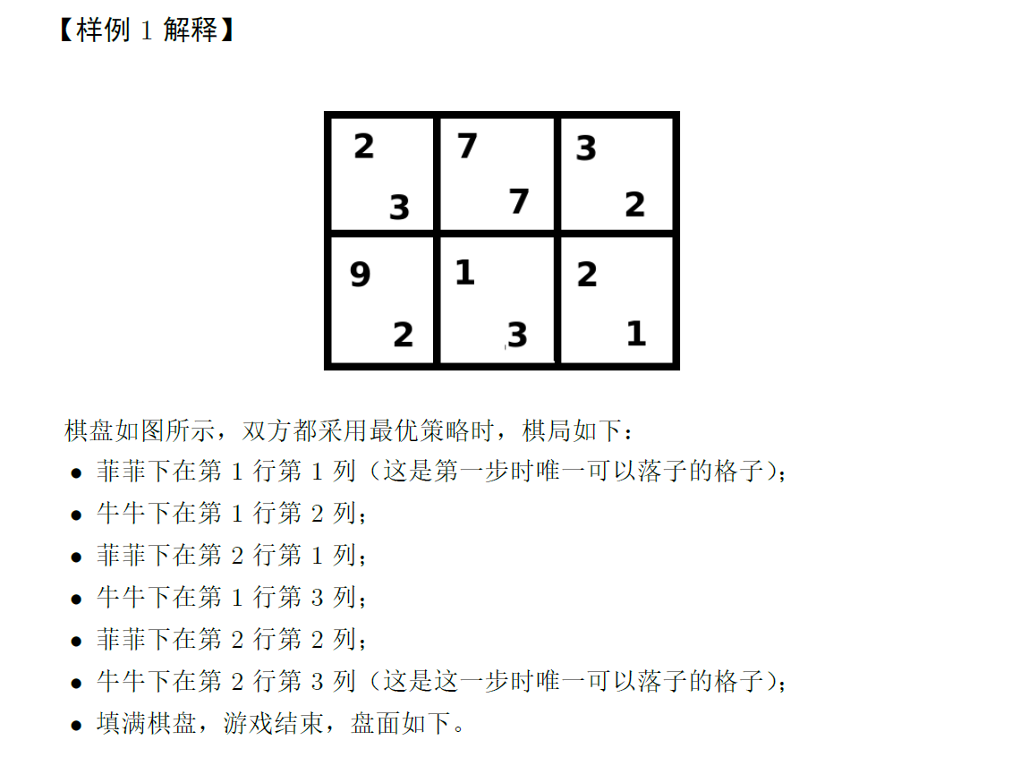 棋局开始时,棋盘上没有任何棋子,两人轮流在格子上落子,直到填满棋盘时结束。落子的规则是:一个格子可以落子当且仅当这个格子内没有棋子且这个格子的左侧及上方的所有格子内都有棋子。