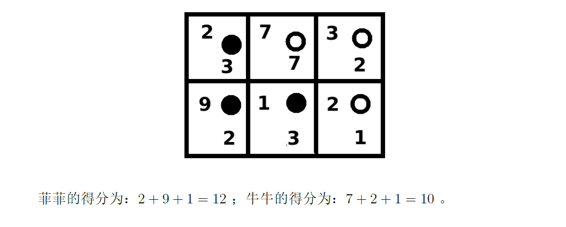 棋盘的每个格子上,都写有两个非负整数,从上到下第 $i$ 行中从左到右第 $j$ 列的格 子上的两个整数记作 $A_{ij}$ 、$B_{ij}$ 。在游戏结束后,菲菲和牛牛会分别计算自己的得分:菲 菲的得分是所有有黑棋的格子上的 $A_{ij}$ 之和,牛牛的得分是所有有白棋的格子上的 $B_{ij}$ 的和。