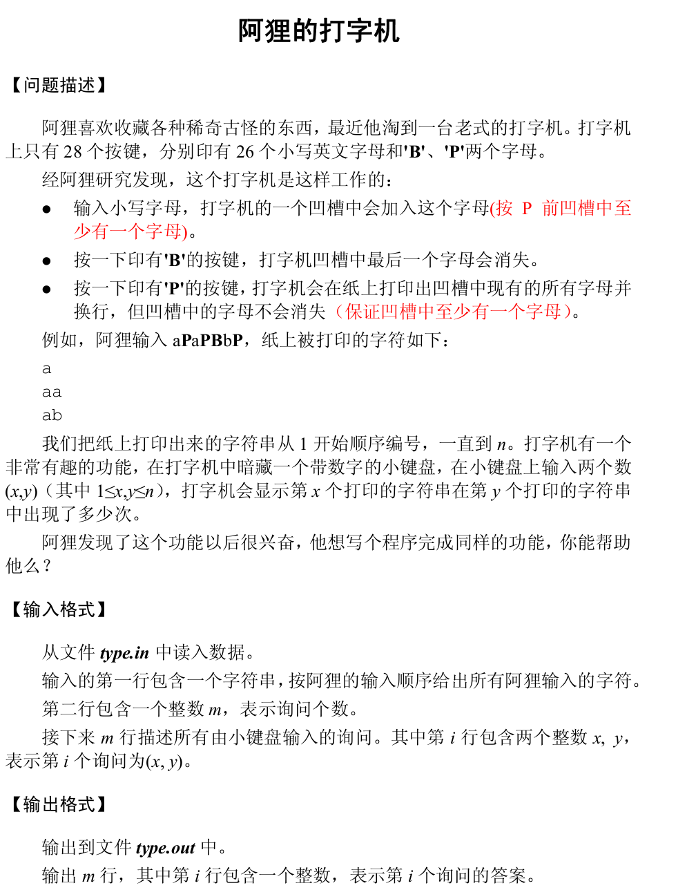 | 题目名称 | 1376. [NOI 2011]阿狸的打字机 |