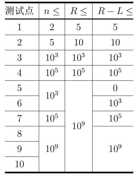 对于所有数据,保证$2\leq n\leq L\leq R\leq 10^9$。