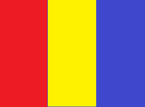 面红、黄、蓝三种颜色布条拼接的旗帜: