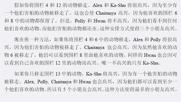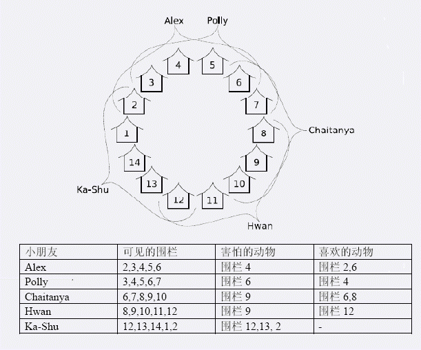 输入的第一行包含两个整数N, C,用空格分隔。N是围栏数(10≤N≤10 000),C是小朋友的个数(1≤C≤50 000)。围栏按照顺时针的方向编号为1,2,3,…,N。接下来的C行,每行描述一个小朋友的信息,以下面的形式给出: E F L X1 X2 … XF Y1 Y2 … YL 其中: E表示这个小朋友可以看到的第一个围栏的编号(1≤E≤N),换句话说,该小朋友可以看到的围栏为E, E+1, E+2, E+3, E+4。注意,如果编号超过N将继续从1开始算。如:当N=14, E=13时,这个小朋友可以看到的围栏为13,14,1, 2和3。 F表示该小朋友害怕的动物数。L表示该小朋友喜欢的动物数。围栏X1, X2, …, XF 中包含该小朋友害怕的动物。围栏Y1, Y2, …, YL 中包含该小朋友喜欢的动物。 X1, X2, …, XF, Y1, Y2, …, YL是两两不同的整数,而且所表示的围栏都是该小朋友可以看到的。小朋友已经按照他们可以看到的第一个围栏的编号从小到大的顺序排好了(这样最小的E对应的小朋友排在第一个,最大的E对应的小朋友排在最后一个)。注意可能有多于一个小朋友对应的E是相同的。