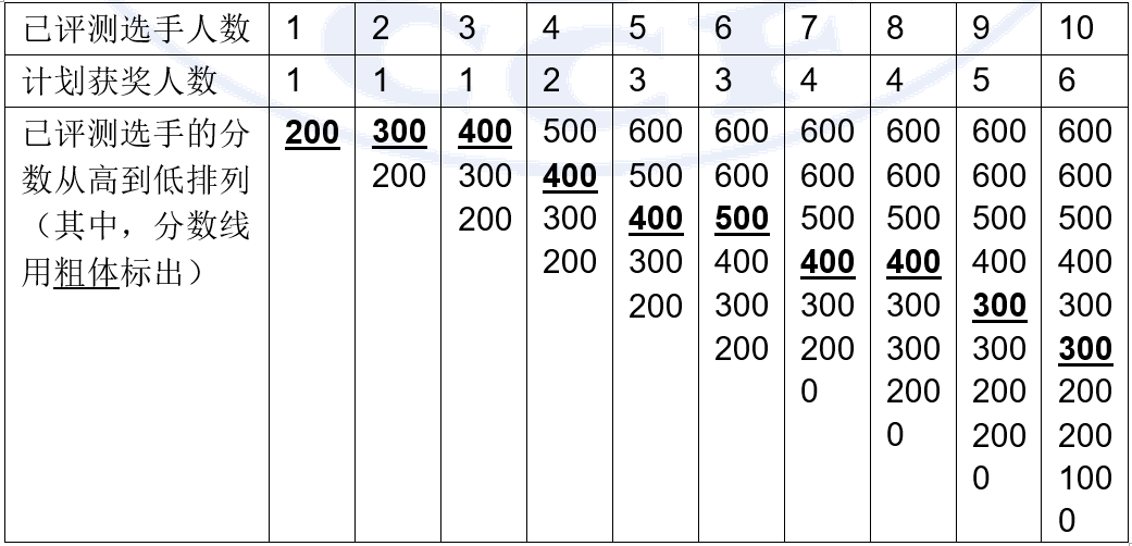 更具体地,若当前已评出了 $p$个选手的成绩,则当前计划获奖人数为 $\max(1,\lfloor p\times w\%\rfloor)$,其中 $w$ 是获奖百分比,$\lfloor x\rfloor$ 表示对 $x$ 向下取整,$\max(x,y)$表示 $x$ 和 $y$ 中较大的数。如有选手成绩相同,则所有成绩并列的选手都能获奖,因此实际获奖人数可能比计划中多。