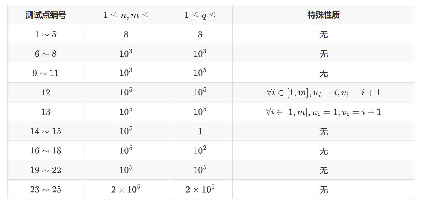 对于 $100\%$ 的数据,$1\le T\le 3,1\le n,m,q\le 2\times 10^5$。