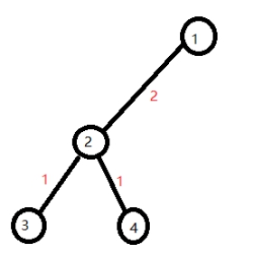 如上图共有3条引线,其中(1,2)引线的单位长度为2,(2,3)引线单位长度为1,(2,4)引线单位长度为1。现在同时点燃所有叶子结点(叶子结点定义为只与一条边相邻的结点,如上图中的叶子结点为1,3,4)。1个单位时间以后,(2,3),(2,4)被完全烧完,(1,2)仅剩一半。这时剩下的半段(1,2)两头均被引燃,所以再过0.5个单位时间后,(1,2)被完全烧完。共需1.5个单位时间。