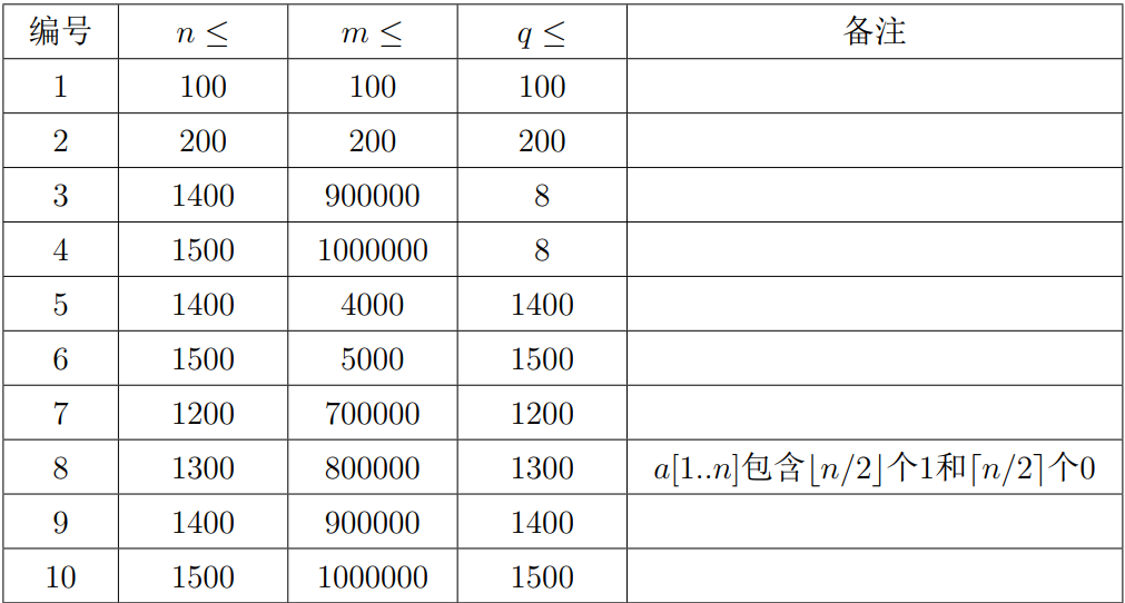 对于所有数据,$1 \leq n \leq 1500,1 \leq m \leq 1000000,1 \leq q \leq 1500,1 \leq l_i,r_i \leq n,0 \leq a[i] \leq 1500$。