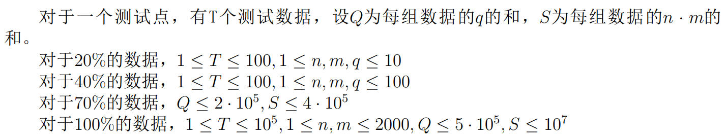 接下来q行,每行四个整数r1,c1,r2,c2(1≤r1≤r2≤n,1≤c1≤c2≤m),表示一个矩形,这个矩形包含所有满足r1≤r≤r2,c1≤c≤c2的网格(r,c)。