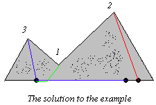 对于样例,第1个人先走到(5,0)再爬到2号端点,第2个人直接爬到3号端点。第3个人走到(4,0)然后爬到1号端点,如下图:
