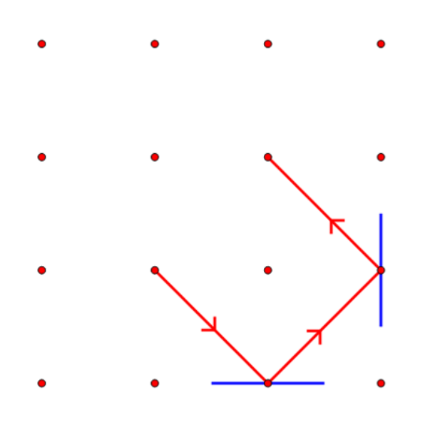 2. 否则,吃豆人的行进路线将以这条边界为镜面发生反射,下图展示了一个路径某两次发生反射的例子: