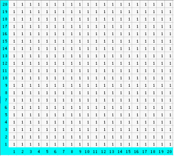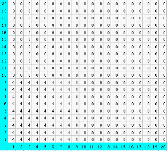 例如,左图是一个20*20的矩形格,蓝色标示出了坐标。已经按照游戏要求在每个格子中放入了一个金币。而在转换后金币将会变成右图。