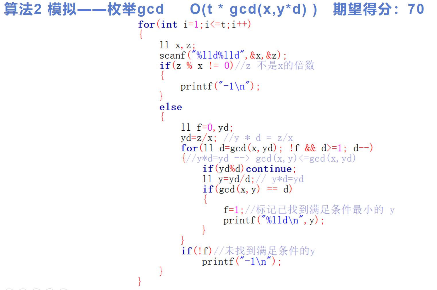 原式可以化为 $\displaystyle{\sum_{p \in primes}\sum_{i = 1}^n\sum_{j = 1}^m[(i, j) = p]}$ 注意到,$[(i, j) = p] = [\frac{(i, j)}{p} = 1] = [(\frac{i}{p}, \frac{j}{p}) = 1]$,因此原式进一步化为 $\displaystyle{\sum_{p \in primes}\sum_{i = 1}^n\sum_{j = 1}^m\sum_{d \mid (\frac{i}{p}, \frac{j}{p})}\mu(d)}$ 我们交换求和顺序,有 $\displaystyle{\sum_{p \in primes}\sum_{d = 1}\mu(d)\sum_{i = 1}^n[d \mid \frac{i}{p}]\sum_{j = 1}^m[d \mid \frac{j}{p}]}$ 注意到,$1 \sim \frac{n}{p}$ 中 $d$ 的倍数有 $\left \lfloor \frac{\frac{n}{p}}{d} \right \rfloor = \left \lfloor \frac{n}{dp} \right \rfloor$ 个,因此有 $\displaystyle{\sum_{p \in primes}\sum_{d = 1}^{\min(\frac{n}{p}, \frac{m}{p})}\mu(d) \left \lfloor \frac{n}{dp} \right \rfloor\left \lfloor \frac{m}{dp} \right \rfloor}$ 令 $t = dp$,我们在外层枚举 $t$ $\displaystyle{\sum_{t = 1}^{\min(n, m)} \left \lfloor \frac{n}{t} \right \rfloor\left \lfloor \frac{m}{t} \right \rfloor \sum_{p \in primes, p \mid t} \mu(\frac{t}{p})}$ 我们维护一个 $\mu$ 的前缀和就可以了,具体来说,我们维护一个数组 $S$ ,枚举 $p, t$ ,如果 $p \mid t$ 就令 $S_k \gets S_k + \mu(\frac{t}{p})$,然后接下来就正常的维护前缀和就行了。