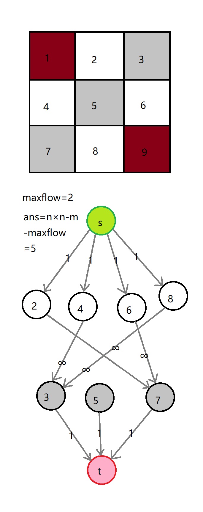·每个红格子向汇点连边,流量为1 跑最大流求出最少扔掉几个骑士,答案为n^2−m−maxflow