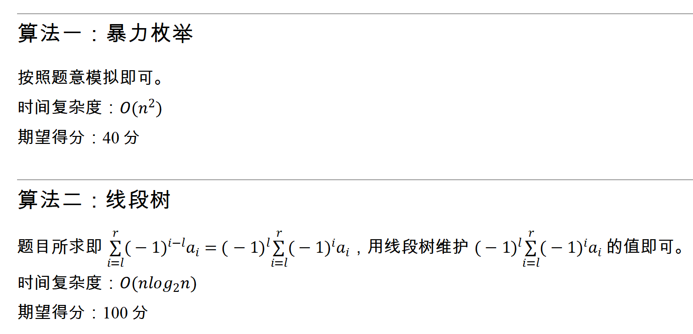 我们可以将序列分为两部分,下标为 $i$ 的数 $a_i$ 属于第 $i%2$ 个部分。那么我们就将序列拆为了两部分,其中用第 $0$ 部分序列和减去第 $1$ 部分的序列和即为交替序列值。